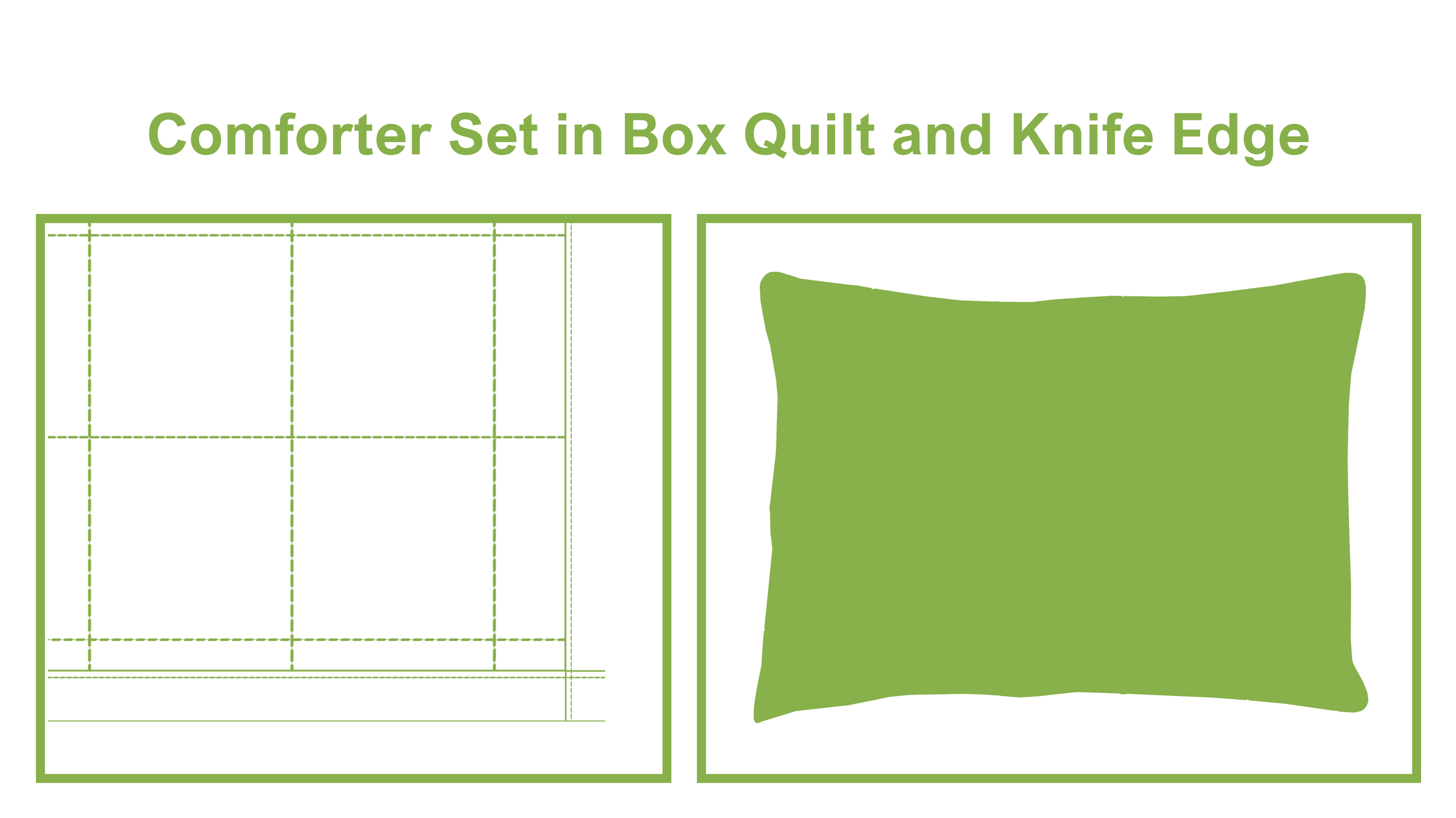 Each Comforter has its own matching sham style. We offer three different finishing styles: Diamond Quilted with Flanged Finishing, Diamond Quilted with Ruffled Finishing, and Box Quilted with Knife Edge Finishing. See the graphic renderings below
