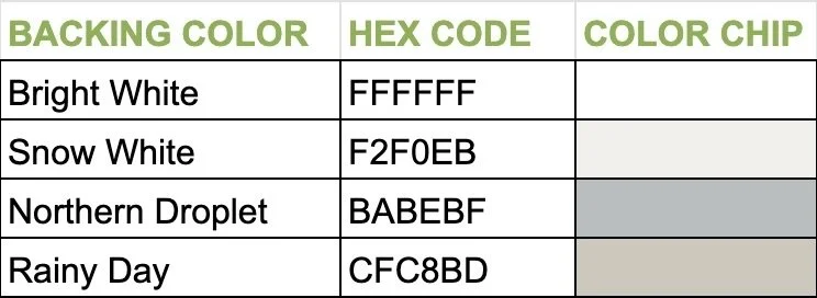 Flange and Ruffle Finishing styles are made from the same Backing Color Options: For example, a Duvet Cover and Sham with Flange finishing and Rainy Day Backing = The Flange is made from the Rainy Day Backing color fabric, therefore matching the Set. See the below graphic and chart that provide HEX color codes and color chips. Keep in mind that the hex codes and color chips are approximate and the closest that we can determine from physical samples. From the computer screen to dyed textiles, colors can vary slightly