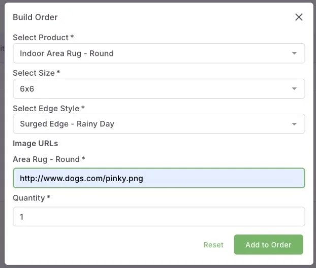 Now you are ready to walk yourself through creating the first line item using the interface like the example image below. Select the product type, all of the options you need, and near the end you’ll add in the Print URL of where this product image is located.